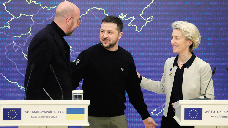 تعهد الرئيس الأوكراني فولوديمير زيلينسكي أمس ألا تضيّع بلاده «يوماً واحداً» للمضي نحو الانضمام إلى الاتحاد الأوروبي، وذلك خلال استقباله قادة الاتحاد، وفيما قال رئيس المجلس الأوروبي شارل ميشال، إنّ «أوكرانيا هي الاتّحاد الأوروبي والاتّحاد الأوروبي هو أوكرانيا»، أعلنت روسيا أنّها «أمّمت» في شبه جزيرة القرم التي ضمّتها، 500 من الممتلكات والأصول الأوكرانية لتمويل الحرب.