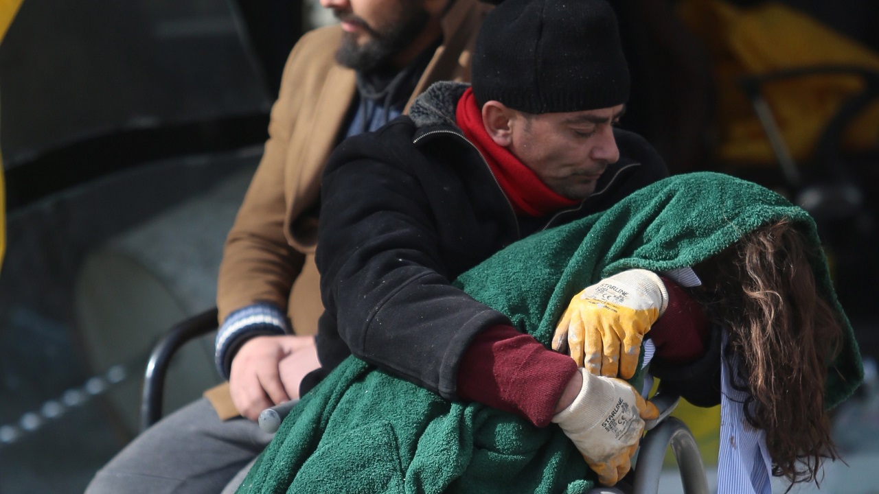 وبنظرة يملأها الحزن والأسى والحنين، كان الأب المكلوم يحتضن جثمان ابنته الملفوف بوشاح ثقيل، وكأنه يمنحها الدفء الأبوي في ظل طقس شديد البرودة يعوق عمليات الإنقاذ، رافضاً أن يكون الجثمان ملقى على الأرض.