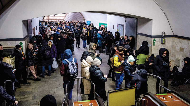 سكان كييف يحتمون في محطة مترو أثناء الإنذار بضربة جوية. أ.ف.ب