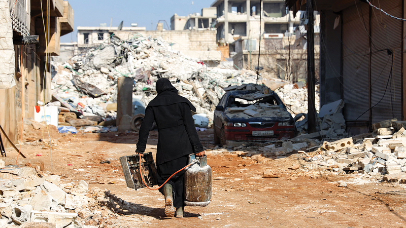 امرأة سورية تحمل موقداً صغيراً وأسطوانة غاز في بلدة جنديرس المتضررة من الزلزال. أ.ف.ب