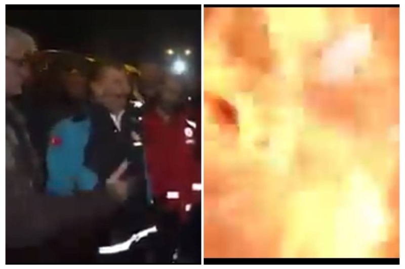 وفي مقطع انتشر على وسائل التواصل الاجتماعي، ظهر وزير الصحة التركي وهو يقف إلى جانب مجموعة من الأطباء الذين يعملون في إحدى المناطق المتضررة من الزلزال، وفجأة تطايرت ألسنة اللهب في الفيديو المتداول، وكان ذلك نتيجة انفجار مدفأة تعمل بالحطب كانت أسفل قدمي المتواجدين الملتفين حولها.