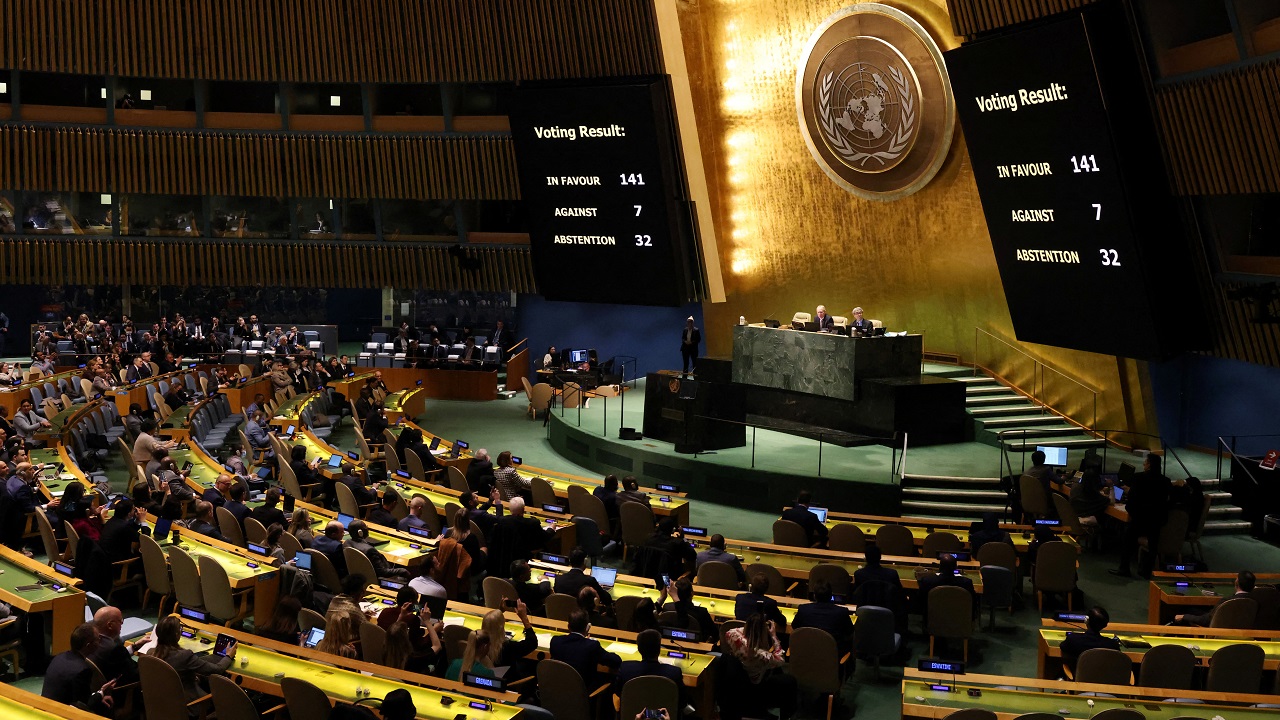 ومن إجمالي 193 دولة عضو في الأمم المتحدة، حصل القرار غير الملزم على تأييد 141 دولة مقابل اعتراض سبعة دول بينها روسيا وبيلاروس وكوريا الشمالية، فيما امتنعت 32 دولة عن التصويت من بينها الصين والهند.