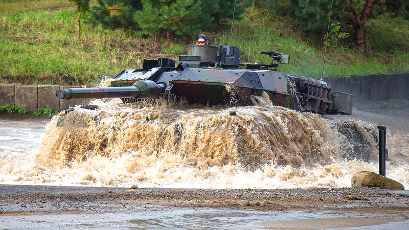 دبابة من طراز «ليوبارد» تمر عبر المياه خلال تدريبات عسكرية في ألمانيا.■ أ.ب