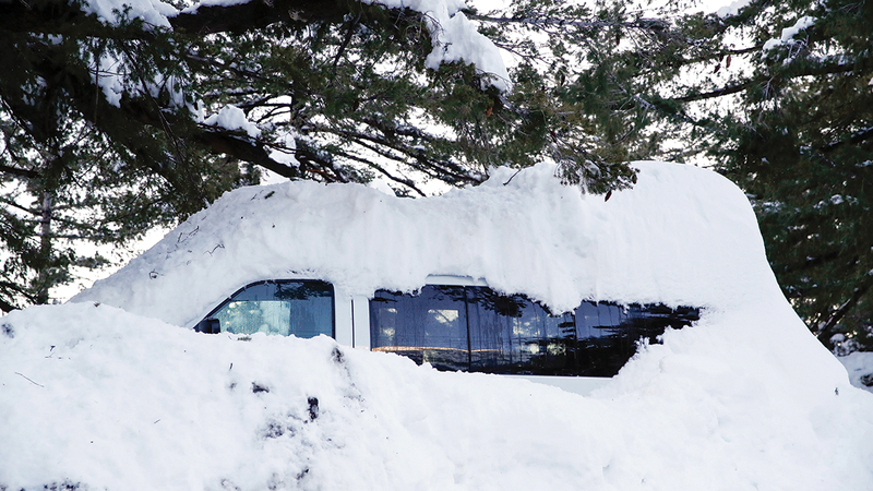الثلج يغطي سيارة نتيجة العواصف الثلجية في جبل بالدي بكاليفورنيا. إي.بي.إيه