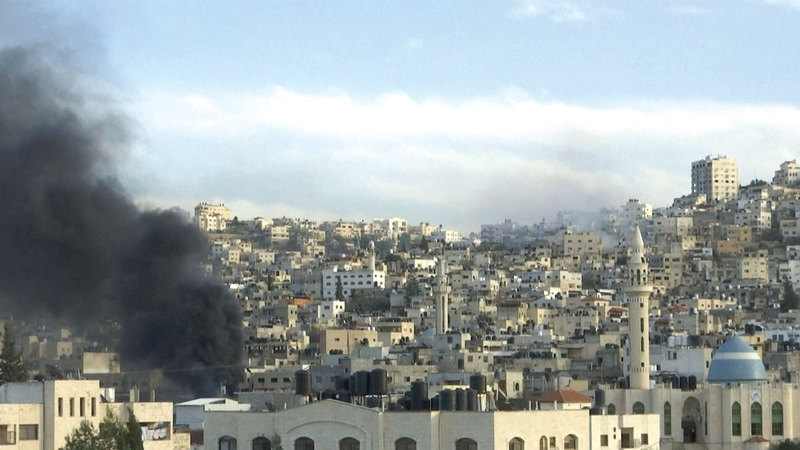تصاعد الدخان من المباني في أعقاب الغارة الإسرائيلية على مخيم جنين للاجئين بالضفة الغربية. أ.ب