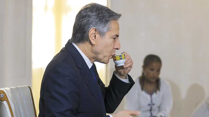 بلينكن يرتشف القهوة التي تشتهر بها إثيوبيا. أ.ب
