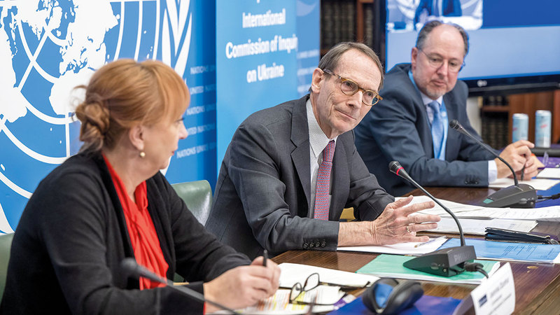 المحققة ياسمينكا دزومهور (يساراً) ورئيس اللجنة إريك موس والمفوض بابلو دي غريف يتحدثون عن تقرير لجنة التحقيق الأممية بشأن أوكرانيا في جنيف. إي.بي.أيه