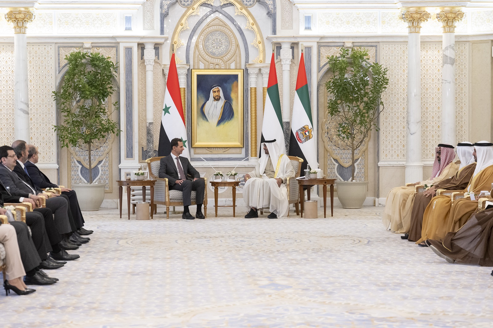ورحب سموه ــ في بداية جلسة المحادثات التي جرت في قصر الوطن ــ بالرئيس بشار الأسد والوفد المرافق في بلده الثاني دولة الإمارات.