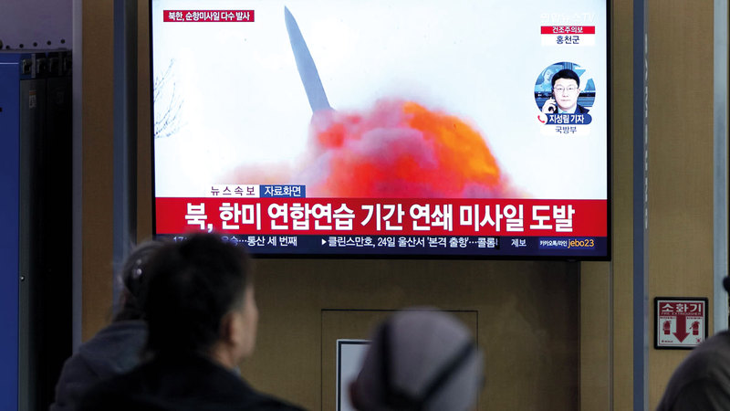 شاشة تلفزيون في محطة سكة حديد سيؤول تعرض إطلاق كوريا الشمالية صاروخ كروز. أ.ب