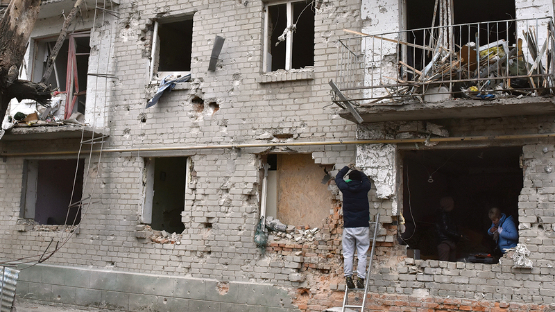 أوكرانيون يتفقدون شقتهم المتضررة جراء قصف روسي على بلدة أوريكوفو. أ.ب