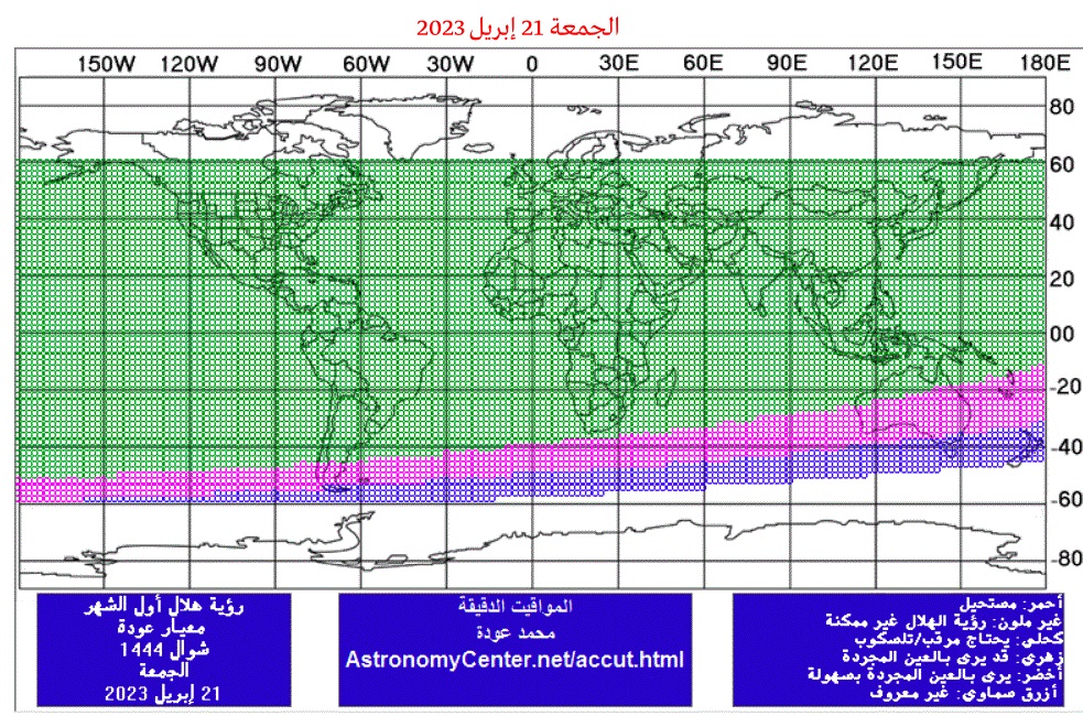 وطبقا لحسابات "مركز الفلك الدولي" وباعتماد التقويم الهجري العالمي المبني على حساب إمكانية رؤية الهلال، فإن بداية شهر شوال تكون يوم الجمعة 21 إبريل.