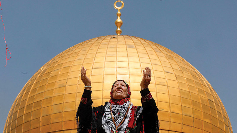 امرأة فلسطينية أمام قبة الصخرة خلال صلاة الجمعة أول من أمس. رويترز