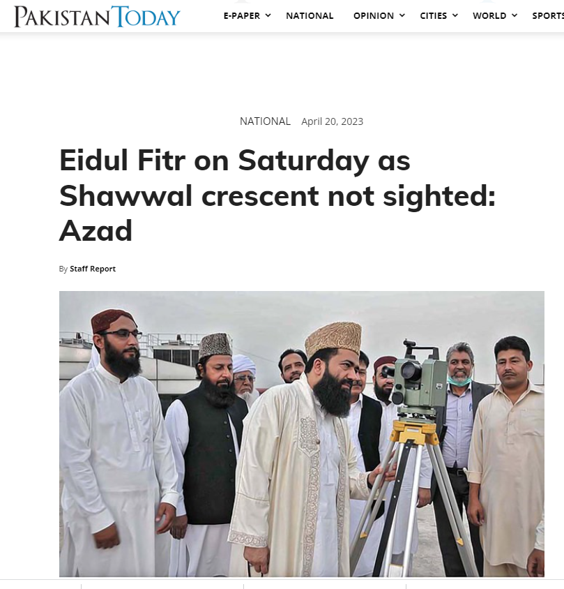 أعلنت باكستان أن السبت 22 إبريل يوم عيد الفطر السعيد وذلك لعدم ثبوت رؤية الهلال، وذلك كما ذكر مركز الفلك الدولي عبر حسابه بموقع التواصل الإجتماعي "تويتر".