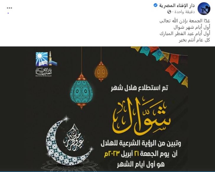 أعلنت دار الإفتاء المصرية أن غداً الجمعة 21 إبريل يوم عيد الفطر السعيد، وذلك كما ذكرت صفحة دار الإفتاء الرسمية على موقع التواصل الإجتماعي "فيس بوك".