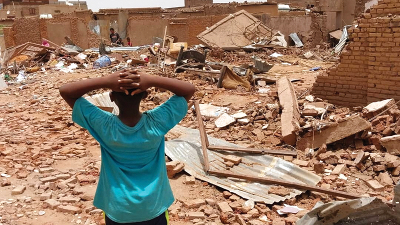 صبي يقف مشدوهاً أمام مبانٍ مدمّرة في أعقاب اشتباكات قوات الدعم السريع والجيش جنوب الخرطوم. رويترز