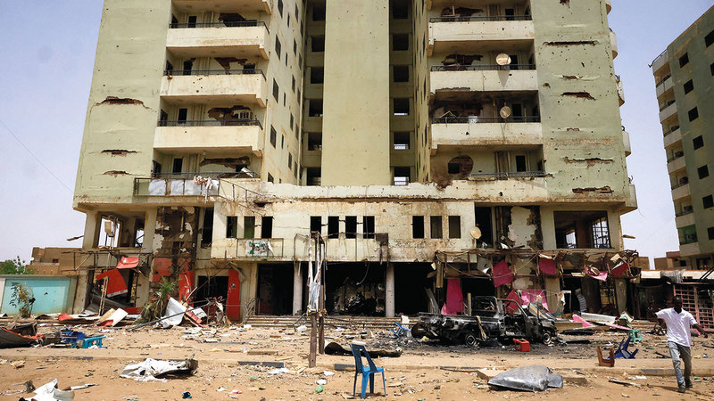 سوداني يمر بالقرب من سيارة ومبانٍ مدمرة في السوق المركزي بالخرطوم بحري نتيجة الاشتباكات. رويترز