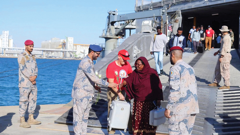 موظفو السفارة السعودية ومسؤولو البحرية الملكية السعودية في ميناء جدة يساعدون مدنياً على النزول ضمن مجموعة تم إجلاؤها من السودان. رويترز