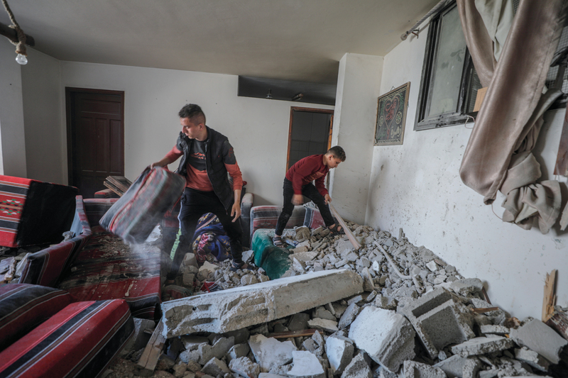 فلسطينيان يتفقدان أنقاض منزل مدمر بعد غارة جوية على غزة أمس. إي.بي.إيه