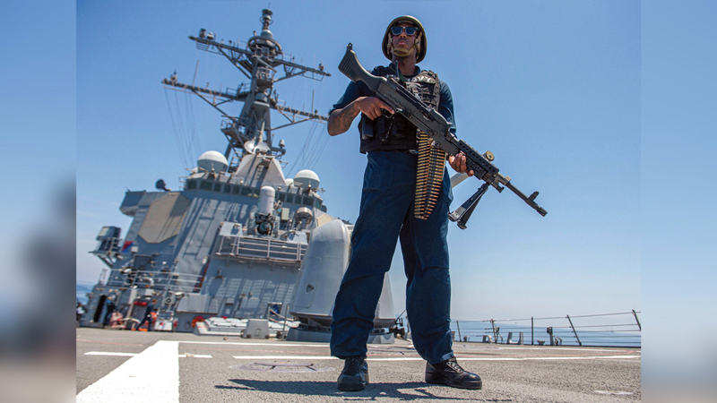 أحد عناصر الأسطول الخامس في مدمرة أميركية أثناء عبورها مضيق هرمز. رويترز