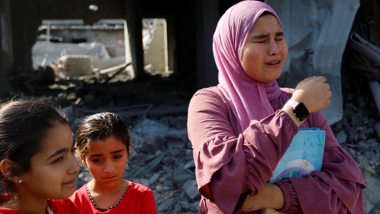 نشرت وكالة رويترز للأنباء، صورة لفتاة فلسطينية وطفلتان وهن يبكين أمام أنقاض منزلهم المنهار في دير البلح وسط قطاع عزة، والذي انهار جراء غارة إسرائيلية قبل سريان الهدنة بين إسرائيل والفصائل الفلسطينية.