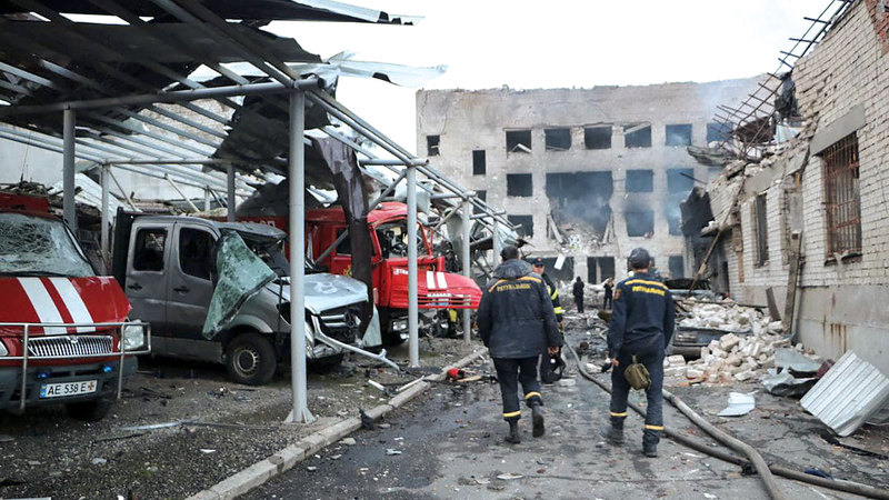 آثار قصف مركز خدمة الطوارئ في مدينة دنيبرو الأوكرانية. إي.بي.إيه