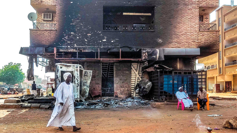 سودانيون أمام فرع بنك محترق في جنوب الخرطوم. أ.ف.ب