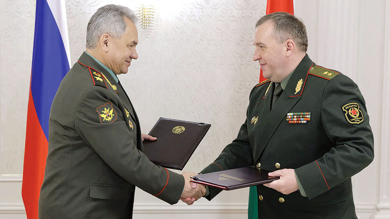 شويغو وخرينين يتصافحان بعد التوقيع على اتفاقية نشر أسلحة روسية نووية في بيلاروسيا. أ.ف.ب