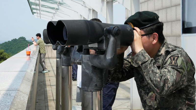 جندي من الجيش الكوري الجنوبي يراقب الجانب الكوري الشمالي من موقع في باجو بالقرب من الحدود المشتركة. أ.ب