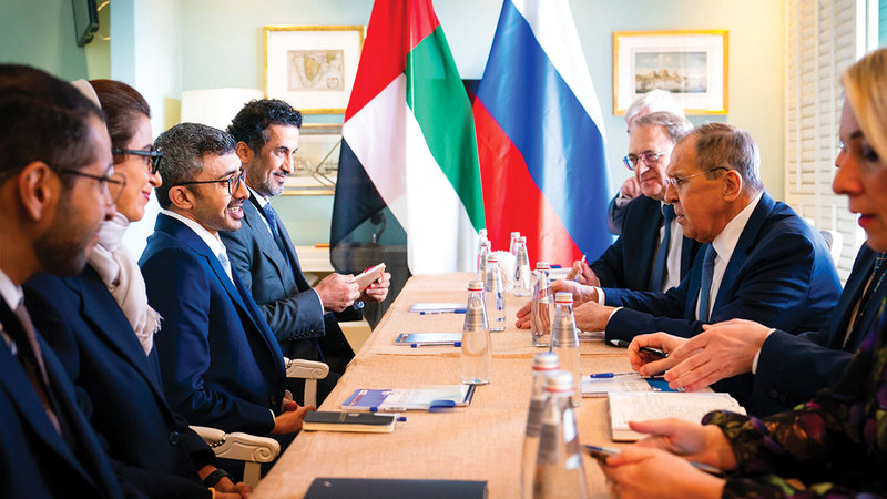 كما استعرض سموه ووزير الخارجية الروسي عدداً من الملفات المرتبطة بجدول أعمال الاجتماع، وبحثا المستجدات على الساحتين الإقليمية والدولية، وتبادلا وجهات النظر بشأنها. وأكد سمو الشيخ عبدالله بن زايد آل نهيان، خلال اللقاء، أن العلاقات الإماراتية الروسية تستند إلى أسس راسخة من التفاهم والاحترام المتبادل والتعاون المثمر والبنّاء، وتشهد نمواً متسارعا، خصوصاً بعد التوقيع على الشراكة الاستراتيجية بين البلدين عام 2018. وأشار سموه إلى حرص البلدين الصديقين على تطوير هذه العلاقات ودفع آفاق التعاون المشترك في المجالات كافة بما يعود بالنفع على شعبيهما ويحقق مصالحهما المتبادلة. وأعرب سموه عن تطلع دولة الإمارات إلى تعزيز التعاون مع دول مجموعة «بريكس» ودعم العمل متعدد الأطراف الهادف إلى تحقيق التنمية في المجتمعات كافة، وحفظ السلم والأمن الدوليين، وترسيخ مستقبل مزدهر للأجيال المقبلة.