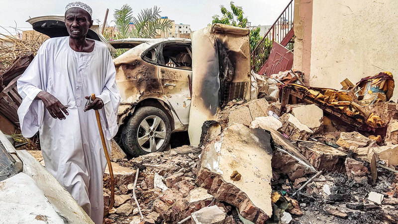 رجل يتفقد الأضرار أثناء سيره بين الأنقاض وسيارة مدمرة خارج منزل أصيب بقذيفة مدفعية في حي الأزهري جنوب الخرطوم. أ.ف.ب