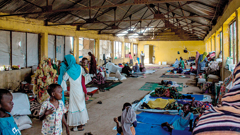 نساء وأطفال يتجمعون في مخيم للنازحين شمال مدينة ود مدني. أ.ف.ب