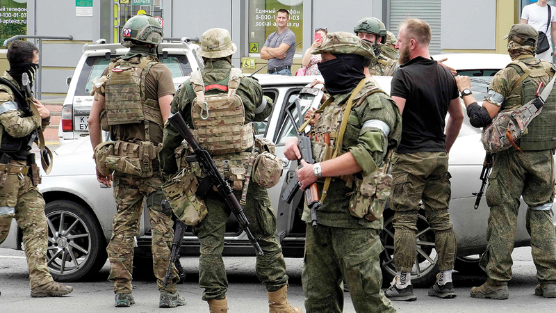 عناصر من «فاغنر» في أحد شوارع «روستوف» قبيل انسحابهم أول من أمس. أ.ف.ب