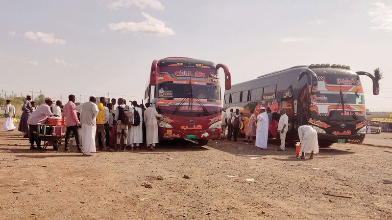 سودانيون يستقلون حافلات للنزوح بعيداً عن الاشتباكات. أ.ف.ب