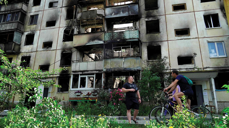 أشخاص يسيرون أمام مبنى دمرته ضربات في بيلغورود. أ.ف.ب