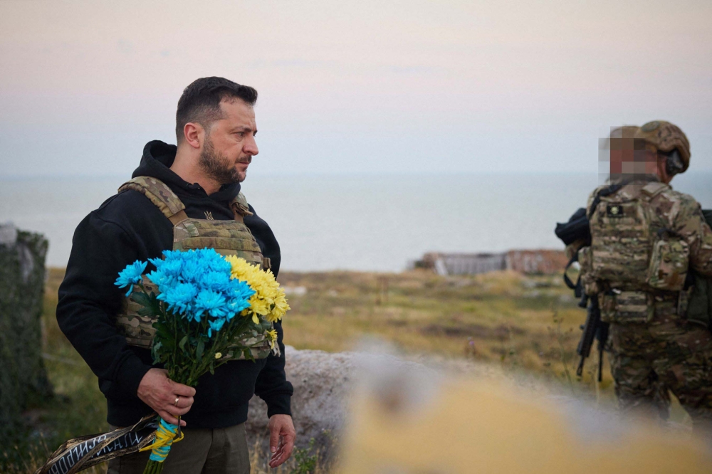 ووضع زيلينسكي، الذي كان يرتدي سترة سوداء فوقها سترة مضادة للرصاص، الزهور تكريما لأولئك الذين دافعوا عن الجزيرة وأثنى على جميع الجنود الذين يقاتلون من أجل أوكرانيا منذ الحرب التي بدأت في 24 فبراير 2022.