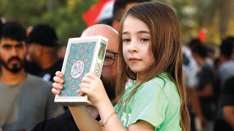 طفلة تحمل المصحف الشريف خلال تظاهرة في العراق احتجاجاً على حرق نسخ من القرآن في الدنمارك والسويد. رويترز