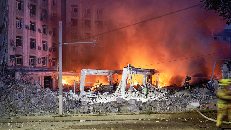 رجال الإطفاء الأوكرانيون يحاولون إخماد حريق في مبنى بعد هجوم صاروخي على دنيبرو. أ.ف.ب