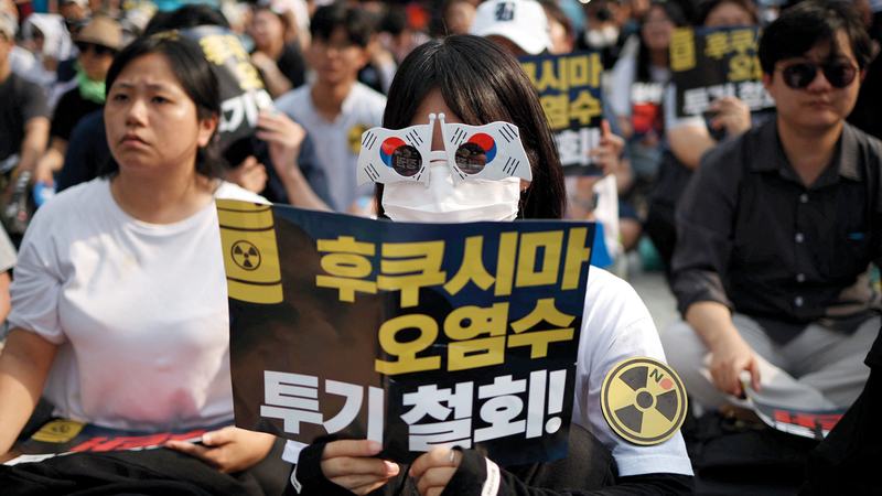 تجمع محتجون في سيؤول، أمس، لمطالبة الحكومة الكورية الجنوبية باتخاذ تدابير لتجنب ما يخشون أن تكون كارثة تلوح في الأفق نتيجة تصريف اليابان مياه معالجة ملوثة بالمواد المشعة من محطة فوكوشيما للطاقة النووية المنكوبة إلى البحر.