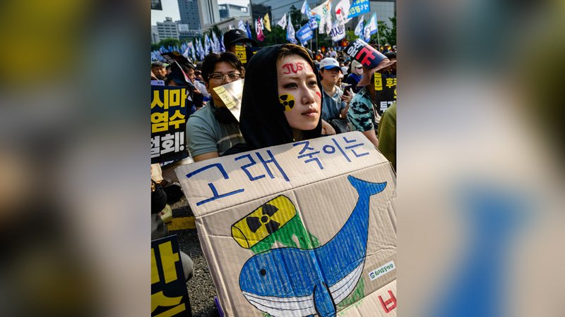 امرأة تحمل لافتة احتجاجية خلال تظاهرة في سيؤول ضد تصريف مياه فوكوشيما في البحر. أ.ف.ب