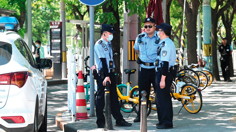 عناصر من الشرطة الصينية أمام مدخل السفارة اليابانية في بكين. أ.ف.ب