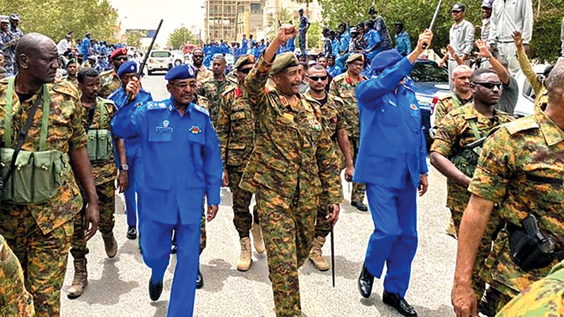 البرهان يمشي بين أفراد من الجيش خلال جولة في أحد أحياء بورتسودان. أ.ف.ب