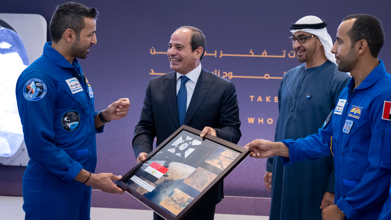 • رئيس الدولة رافق الرئيس المصري للسلام على رواد الفضاء الإماراتيين بأرض المطار، حيث هنأ السيسي فريق العمل بإنجاز سلطان النيادي.