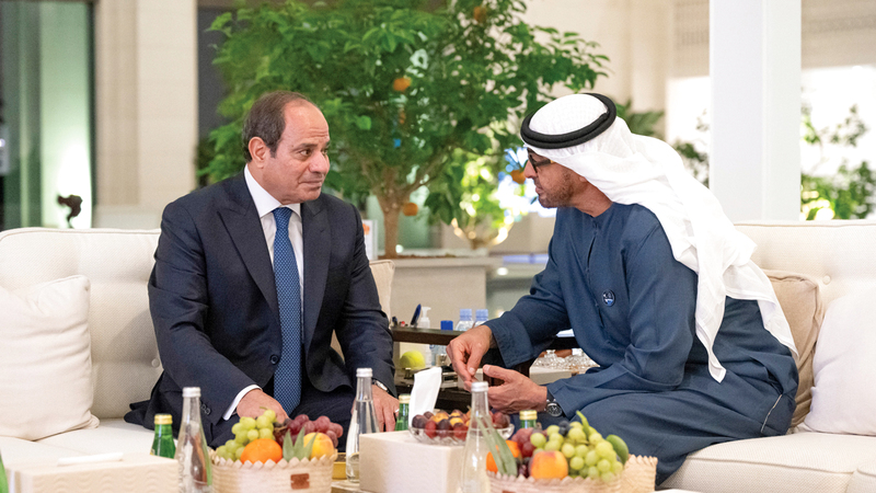• رئيس الدولة وعبدالفتاح السيسي أكدا أهمية العمل على إيجاد حلول سلمية لأزمات المنطقة بالحوار والطرق الدبلوماسية، بما يعزّز السلام والاستقرار الإقليميين.