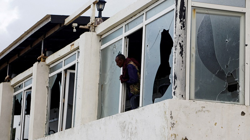 شرطي صومالي ينظر من نافذة محطمة عقب إحدى الهجمات. (صورة أرشيفية)