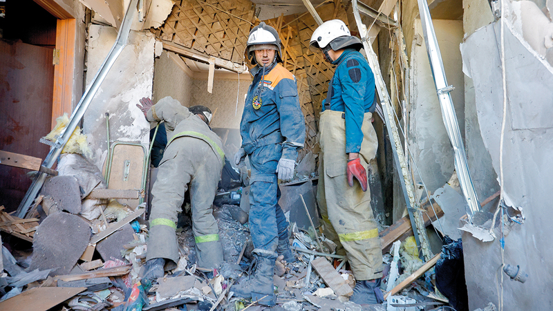 رجال الإنقاذ يزيلون حطام منزل تضرر جراء القصف في دونيتسك التي تسيطر عليها روسيا. رويترز