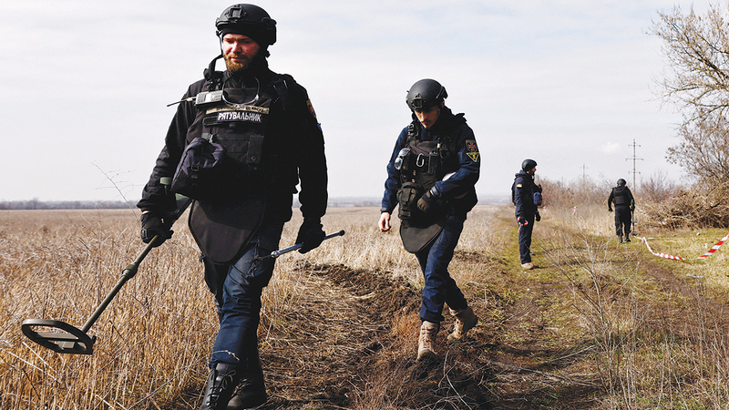 أعضاء قسم إزالة الألغام في أوكرانيا خلال عمليات مسح للألغام الأرضية في منطقة دونيتسك. رويترز