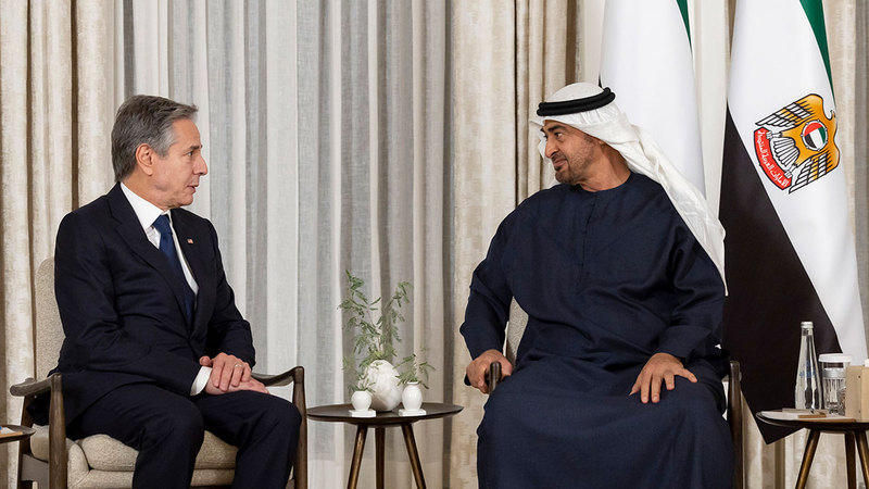 • محمد بن زايد وبلينكن بحثا أهمية العمل على إيجاد أفق سياسي واضح، لضمان تحقيق السلام العادل والشامل الذي يرسخ الأمن والاستقرار الإقليميين.