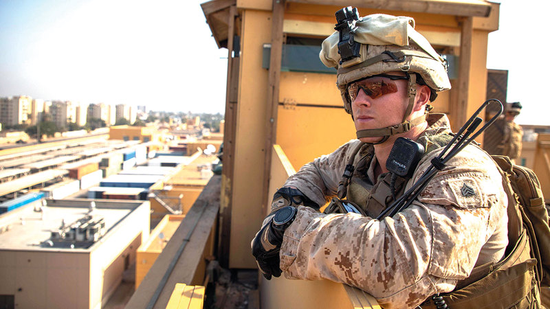 أحد عناصر مشاة البحرية الأميركية يقف حراسة داخل السفارة الأميركية في بغداد. أرشيفية