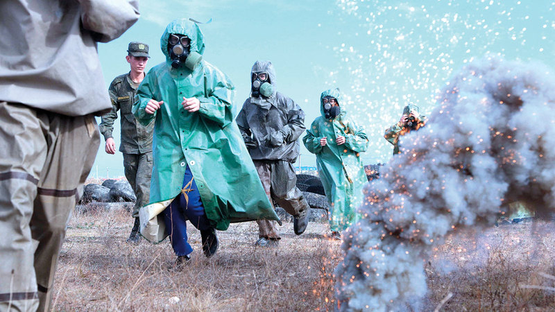 طلاب يرتدون أقنعة وبدلات واقية من الغاز خلال تدريبات تحت إشراف عسكريين في شبه جزيرة القرم. أ.ف.ب