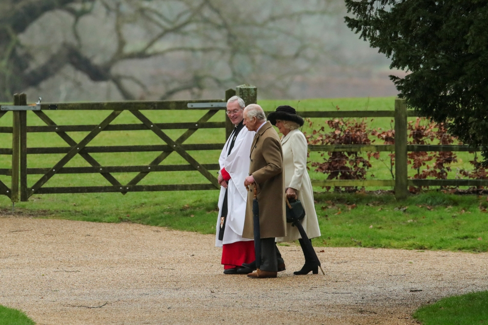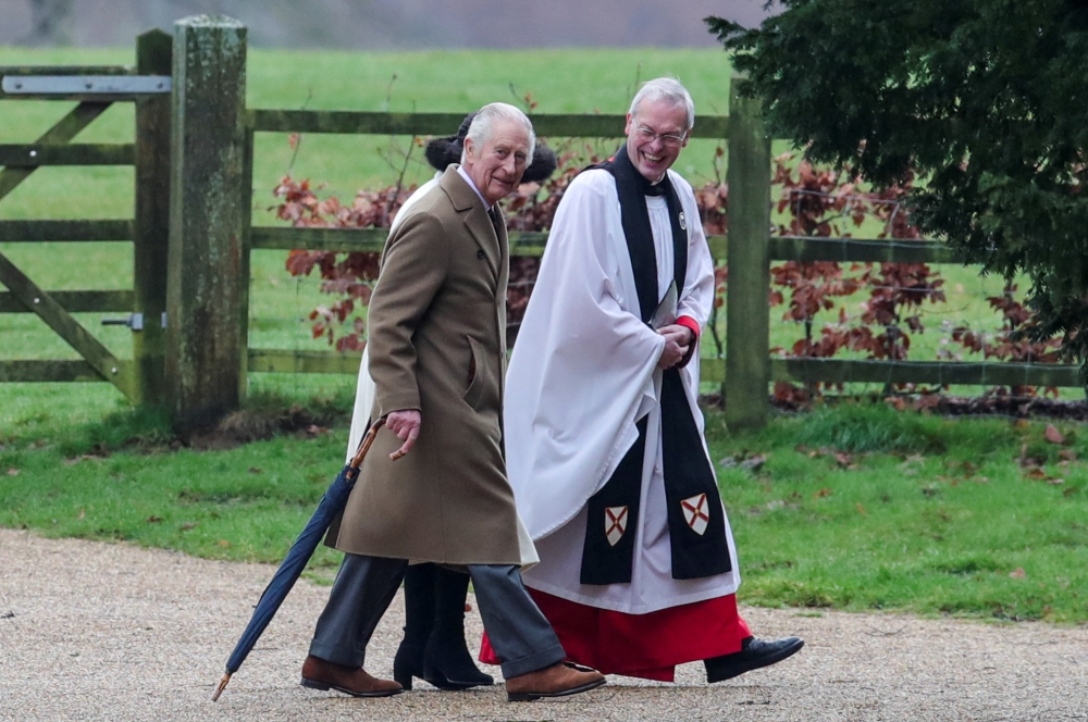 وكان الملك يرتدى معطفا بنيا ويحمل مظلة لدى وصوله مع زوجته الملكة كاميلا إلى كنيسة القديسة مريم المجدلية في ساندرينجهام بشرق إنجلترا.